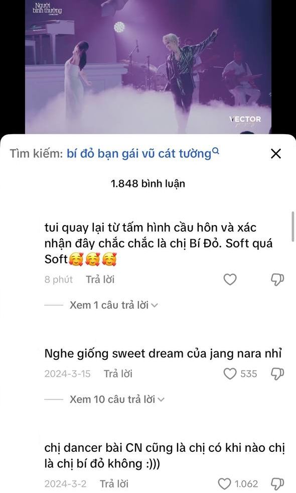 Đáng nói, trên sân khấu live Từng Là thuộc concert Người Bình Thường, Vũ Cát Tường từng tay trong tay với một nữ chính cực kỳ xinh đẹp. Nay, người hâm mộ lại càng có thể khẳng định nữ chính ngày ấy nhảy đôi với Vũ Cát Tường chính là bạn gái Bí Đỏ. Cả hai trao cho nhau cái nhìn đắm đuối, tay trong tay xoay vần theo giai điệu ca khúc Từng Là.
