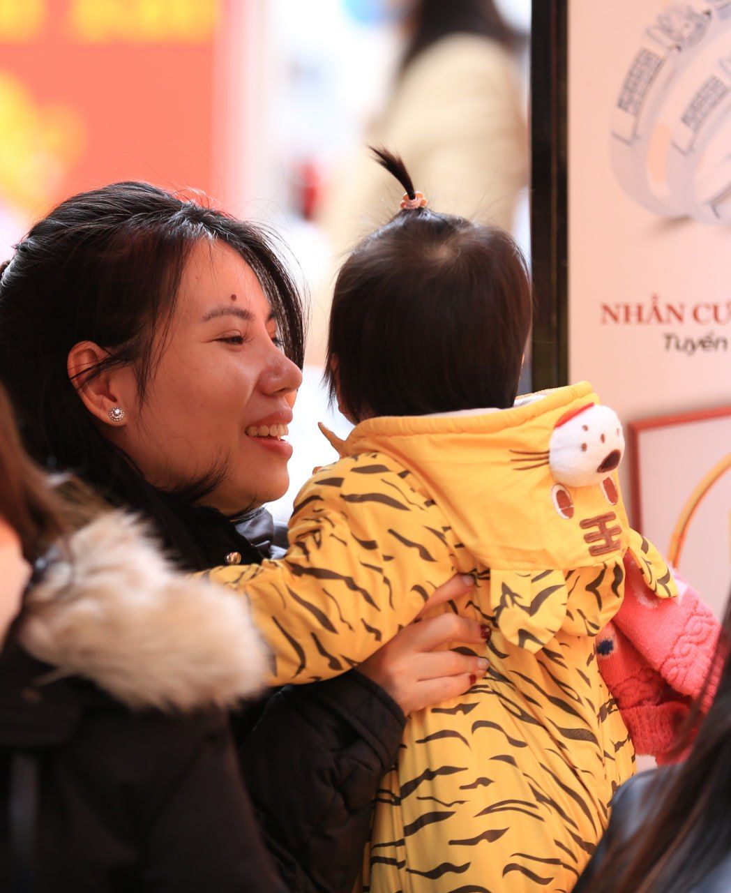 Chị Nga bảo rằng năm nay đặc biệt hơn bởi có con đi cùng. "Con nhà tôi mới được 13 tháng tuổi, nãy ở nhà, tôi cũng cho con ăn uống đầy đủ rồi mới đưa đi. Bình thường trong năm tôi vẫn mua, nhưng vào dịp này, giá vàng tăng cao nên tôi chỉ mua một ít để lấy "vía" may mắn đầu năm", chị Nga cho hay.